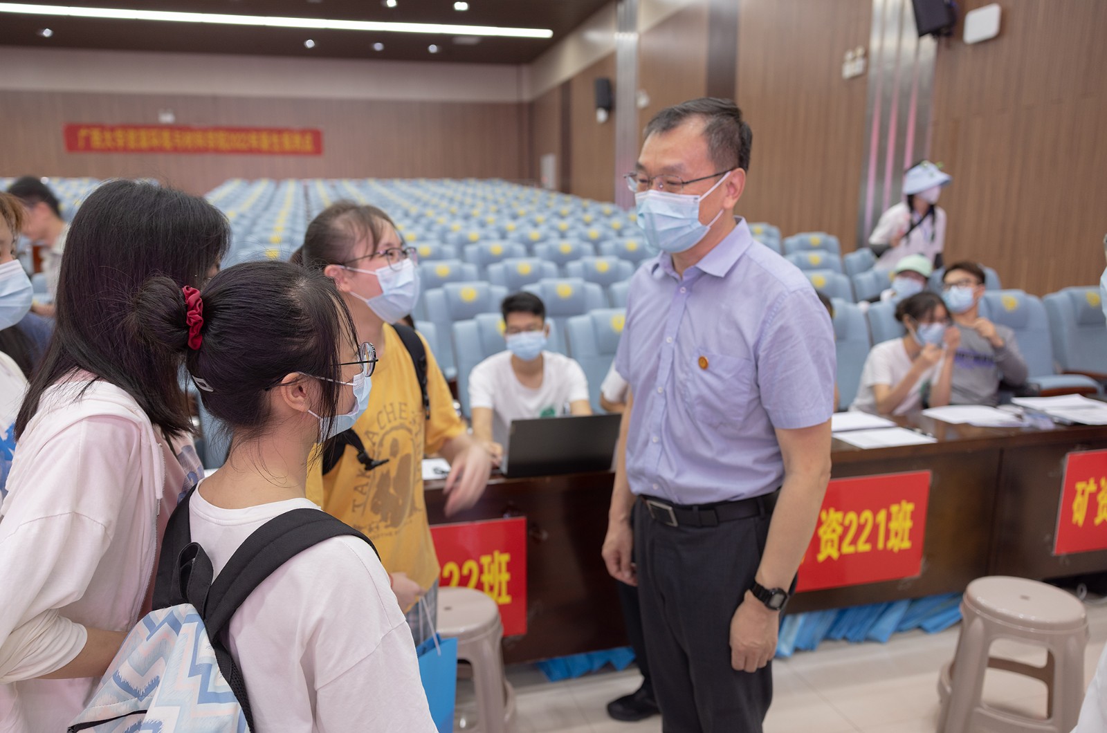 在资源环境与材料学院的迎新现场,韩林海详细了解新生办理报到手续的工作流程,询问新生入学教育、教学工作的准备情况。
