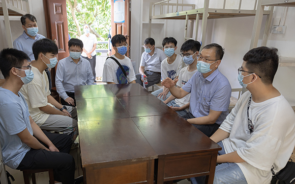 随后,韩林海来到经济学院学生宿舍,看望新生同学。他仔细查看了同学们的宿舍情况,并和同学们唠嗑拉家常,“老家是哪里的?对广西的气候适应吗?还习惯南宁的饮食吧?”在轻松愉快的气氛中,新生们畅所欲言,纷纷作自我介绍。来自福建泉州的代柯铭同学说,美丽的广西山清水秀、气候宜人,和家乡差不多,对未来的大学生活满怀憧憬;来自广西玉林的莫炜平同学和江苏南通的刘鑫鑫同学说,在进入大学前就定好了学习目标,希望四年毕业后继续攻读硕士研究生。韩林海对同学们的目标表示赞许,他叮嘱同学们要尽快适应大学生活,善于自我管理,学会与舍友和同学相处。他勉励同学们要树立远大理想,合理规划好大学生活,承担起新时代大学生应该肩负的责任和使命,做一个德智体美劳全面发展的合格大学生,成为合格的社会主义接班人和建设者。