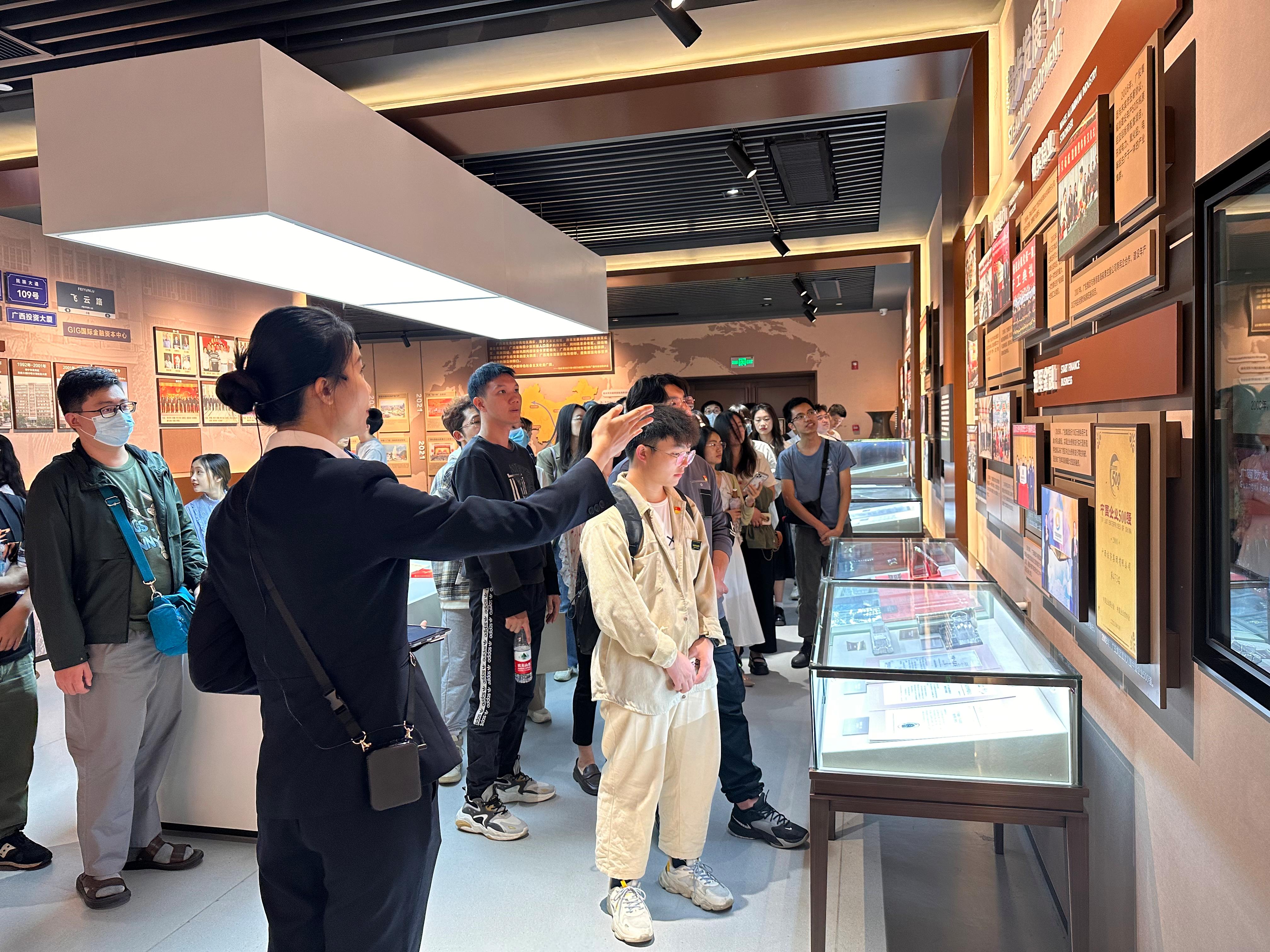 在讲解人员的陪同下,我校师生实地参观了广西投资集团发展历史馆的文化展厅和党建展馆。从大量的文字、历史图片、视频和实物中师生们了解到广西投资集团从无到有、从中国企业500强到西南首家世界500强的发展历史和优异成绩,深刻感受新时代国企的强劲动力和发展韧性。通过模型、电子书、多媒体等形式,师生们从广投能源文化展厅、南南铝加工数字化展厅、广投数字经济示范基地展示中心等各企业馆中深入全面的了解到广投集团业务的深度和宽度,明确了国有企业作为国民经济“稳定器”和“压舱石”的意义和责任。