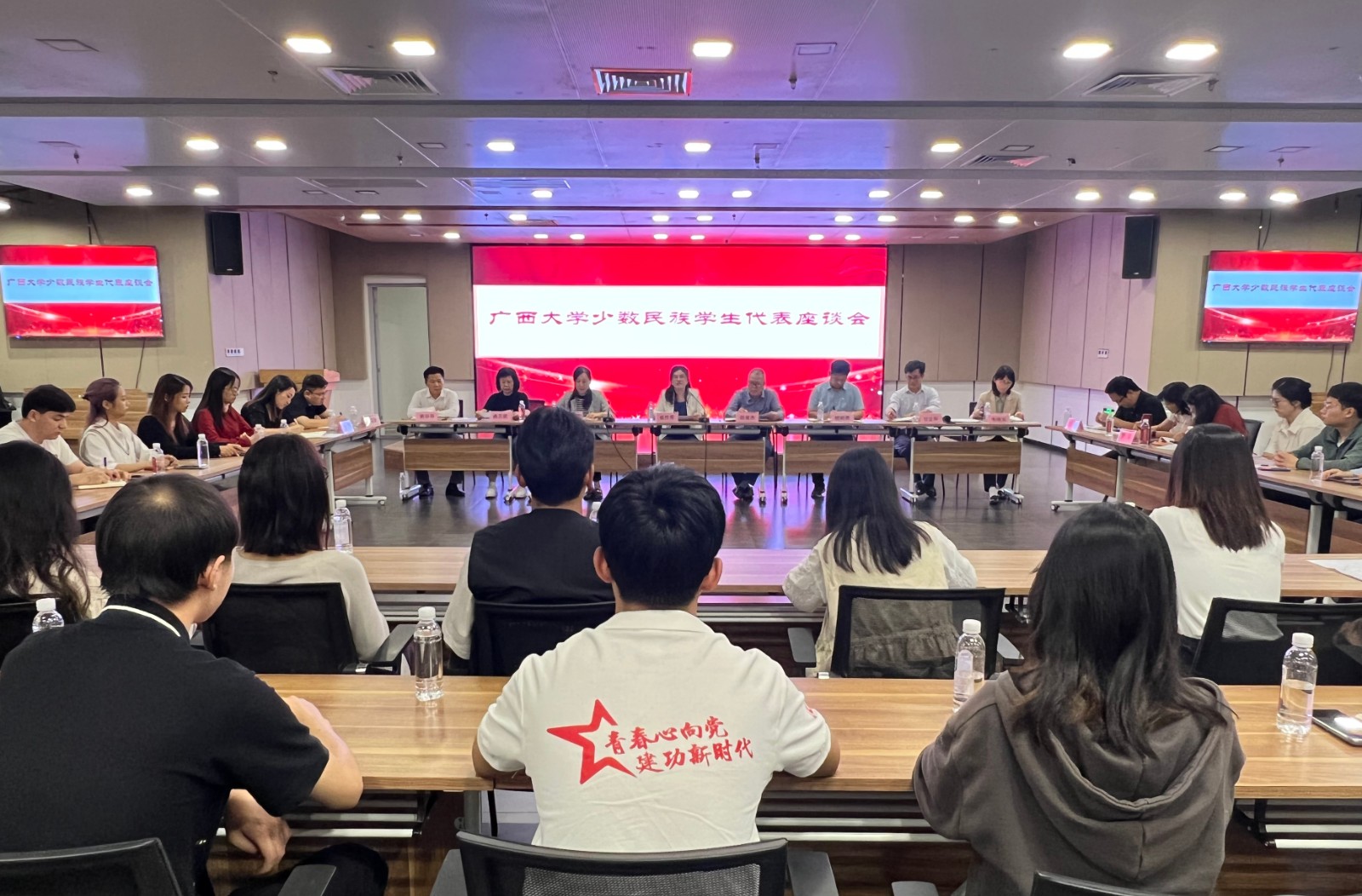 为深入学习贯彻党的二十大精神,学习贯彻习近平新时代中国特色社会主义思想主题教育走深走实,进一步了解少数民族学生思想、学习、生活情况,助力学生成长成才,5月12日上午,我校在大学生活动中心召开少数民族学生代表座谈会,党委统战部、学生工作部(处)、武装部、国有资产与实验室管理处相关负责人、新疆内派教师、各民族学生代表40余人参加座谈会。