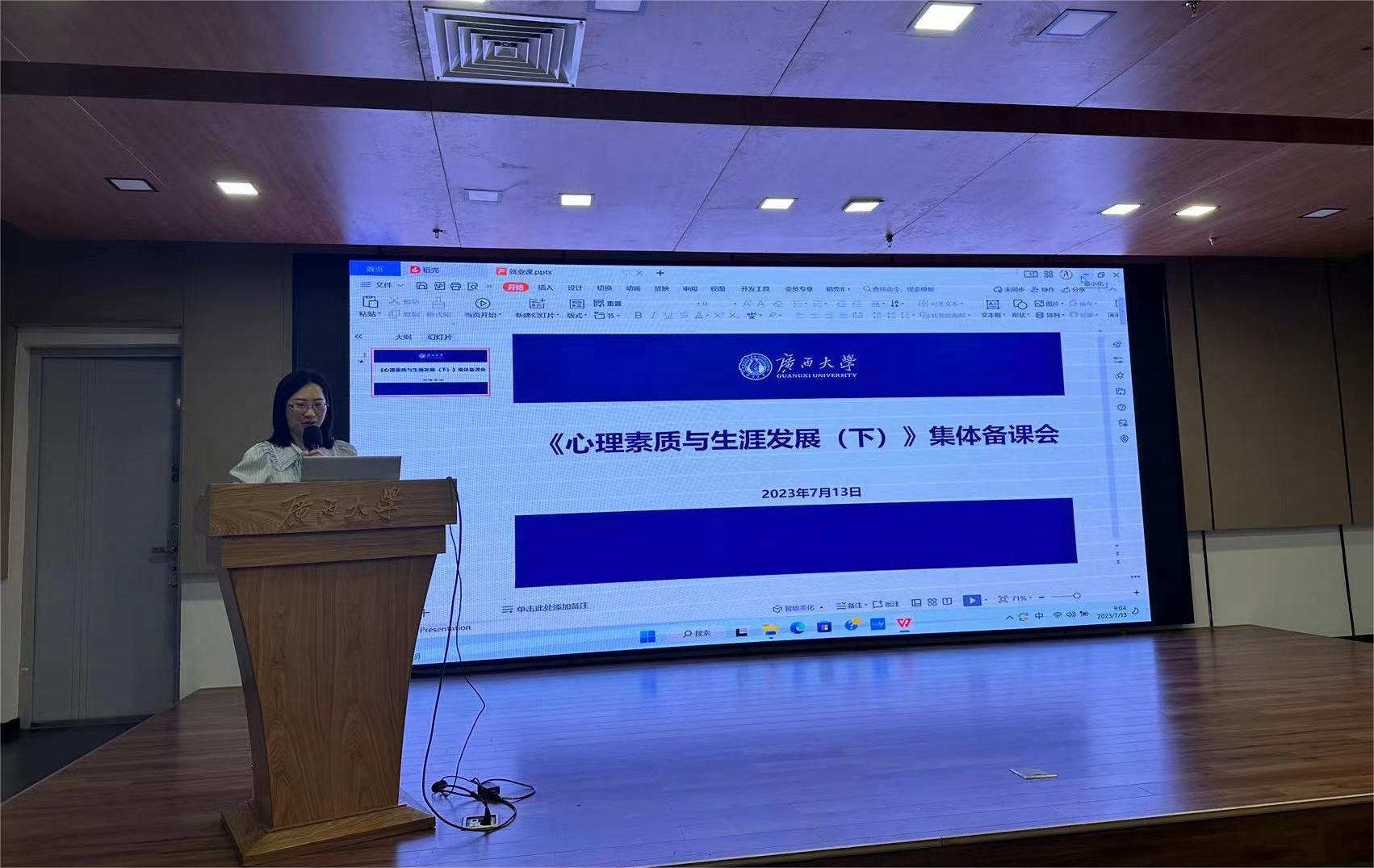 备课会上,学生工作处教师王曼从课程设置和教学内容两方面展开介绍,说明了课程性质、教学对象和授课目的,并对课程内容进行串讲展示;电气工程学院辅导员蒋冬连从教学思路、教学内容、教学方法等方面分享了自己的教学经验与心得;学堂在线广西区域负责人梁成龙详细介绍了雨课堂在智慧教学中的技术使用。