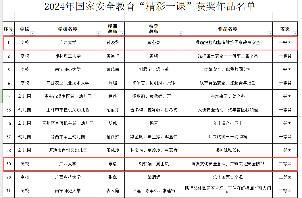 据悉,为深入学习贯彻习近平总书记总体国家安全观,提高国家安全教育课质量,提升教师授课水平,自治区教育厅于2024年2月-6月开展了2024年国家安全教育“精彩一课”征集和评选活动。最终,经专家评审,共评选出一等奖68名、二等奖 107 名、三等奖 147 名、优秀奖 221 名。