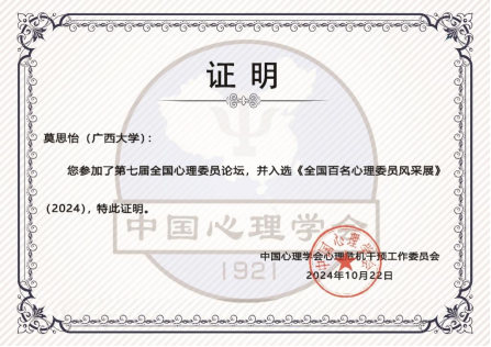 10月16日至18日,由中国心理学会心理危机干预工作委员会主办、北京大学承办的第十九届全国高校心理委员工作研讨会暨朋辈辅导论坛在北京大学百周年纪念讲堂举行。我校学生心理发展指导中心教师黄雪雯、姚璎珊,新闻与传播学院吴茜、资源环境与材料学院莫思怡2名学生心理委员受邀参加此次论坛,2名学生相关优秀事迹入选《全国百名心理委员风采展》(2024)著作。