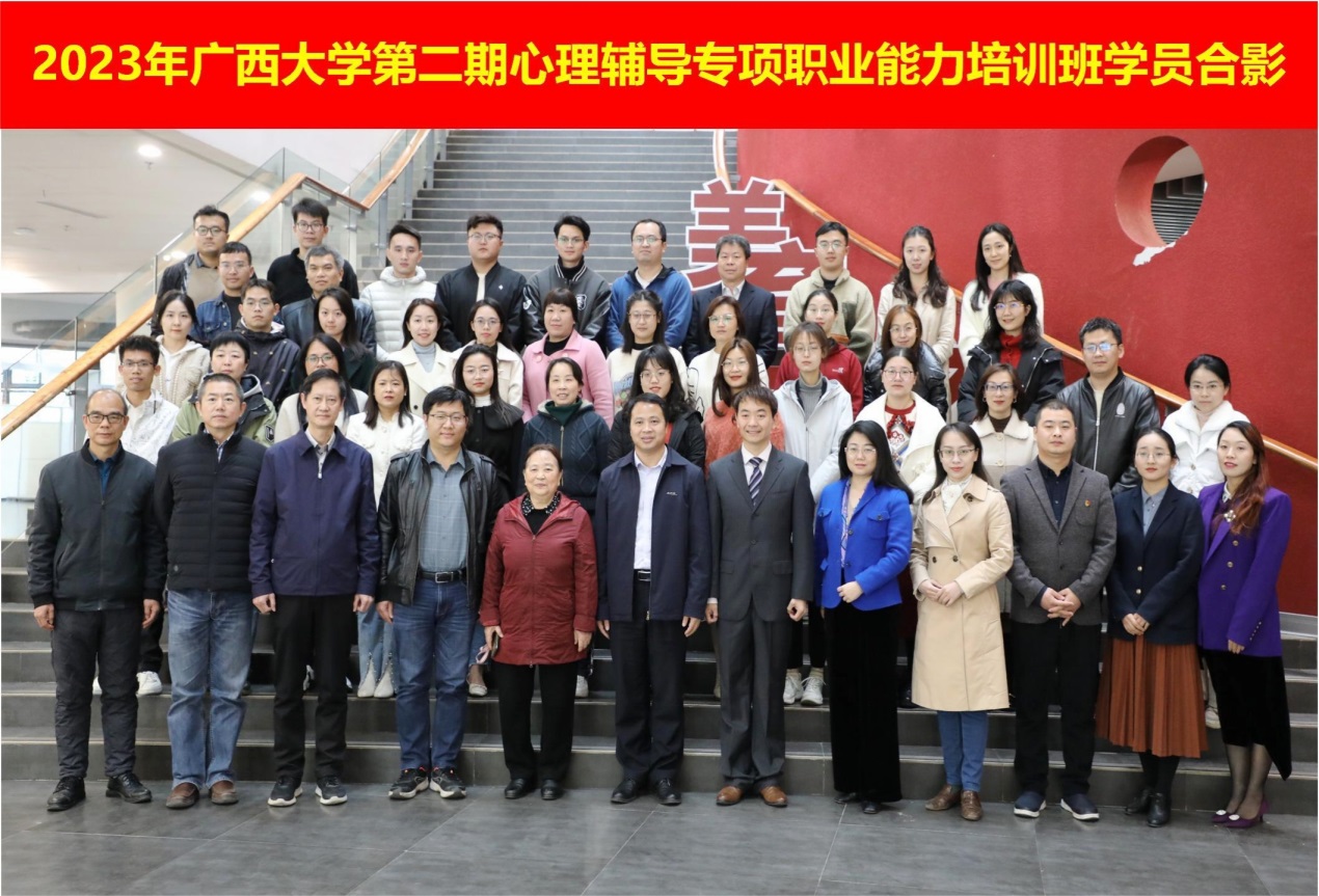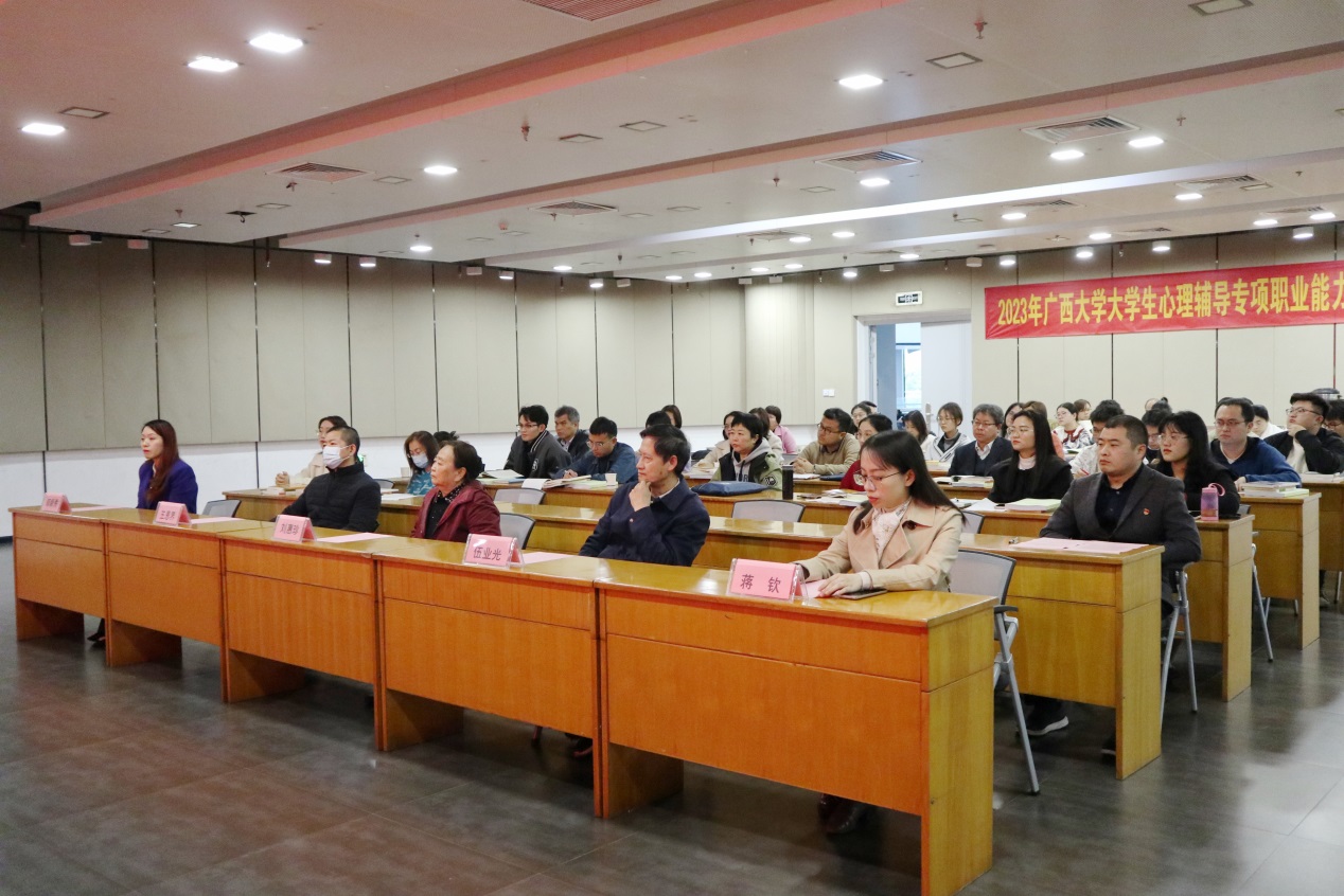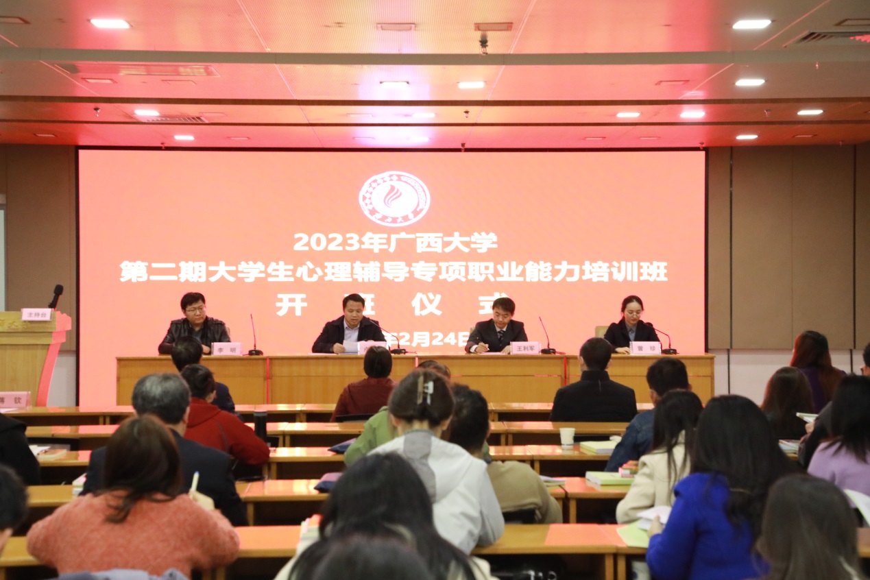 224日,2023年beat365手机版官网入口第二期大学生心理辅导专项职业能力培训班开班仪式在我校大学生活动中心三楼报告厅举行。广西壮族自治区职业技能鉴定中心主任卢有连、beat365手机版官网入口学生工作部(处)副部(处)长王利军、beat365手机版官网入口资产经营有限公司党委副书记李明出席开班仪式。广西心理卫生协会专家委员会委员、心理咨询与心理治疗督导中心主任刘惠珍教授,广西心理卫生协会秘书长、广西心理卫生协会临床心理专业委员会主任委员伍业光教授,beat365手机版官网入口马克思主义学院副院长王恩界教授,beat365手机版官网入口马克思主义学院博士生导师蒋钦副教授,第一期培训班学员代表参加开班仪式