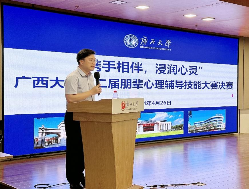 最后,学生工作部(处)副部处长黄晋进行总结讲话,他高度肯定了同学们参加本次比赛的热情,以及现场参赛选手的精彩表现。他表示,参赛选手们不仅展现了出色的心理助人技能和心理健康素养,更在与同学们的交流互动中积累经验,提高朋辈心理辅导工作水平。勉励同学们充分发挥朋辈优势,做心理健康知识的宣传员,做同学们的支持者,不断丰富朋辈心理健康理论知识并付诸实践,实现“助人、自助、互助”共成长,让朋辈关怀的正能量辐射成为学生心理健康水平的有力支撑。