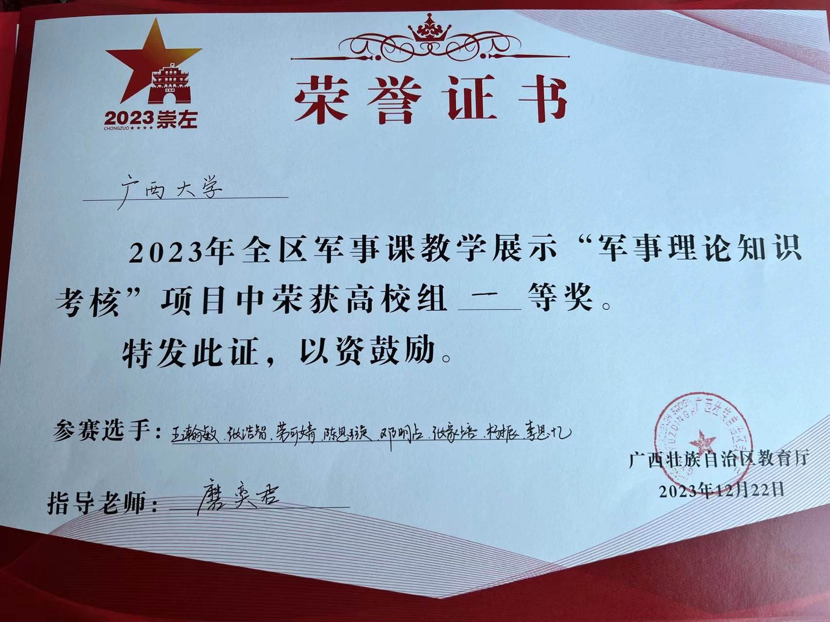 12月21日,由自治区教育厅主办的2023年全区军事课教学展示活动在桂林理工大学南宁分校落下帷幕。经过激烈角逐,我校代表队分别斩获一等奖1项、二等奖4项、三等奖3项的好成绩,并荣获高校组综合二等奖。