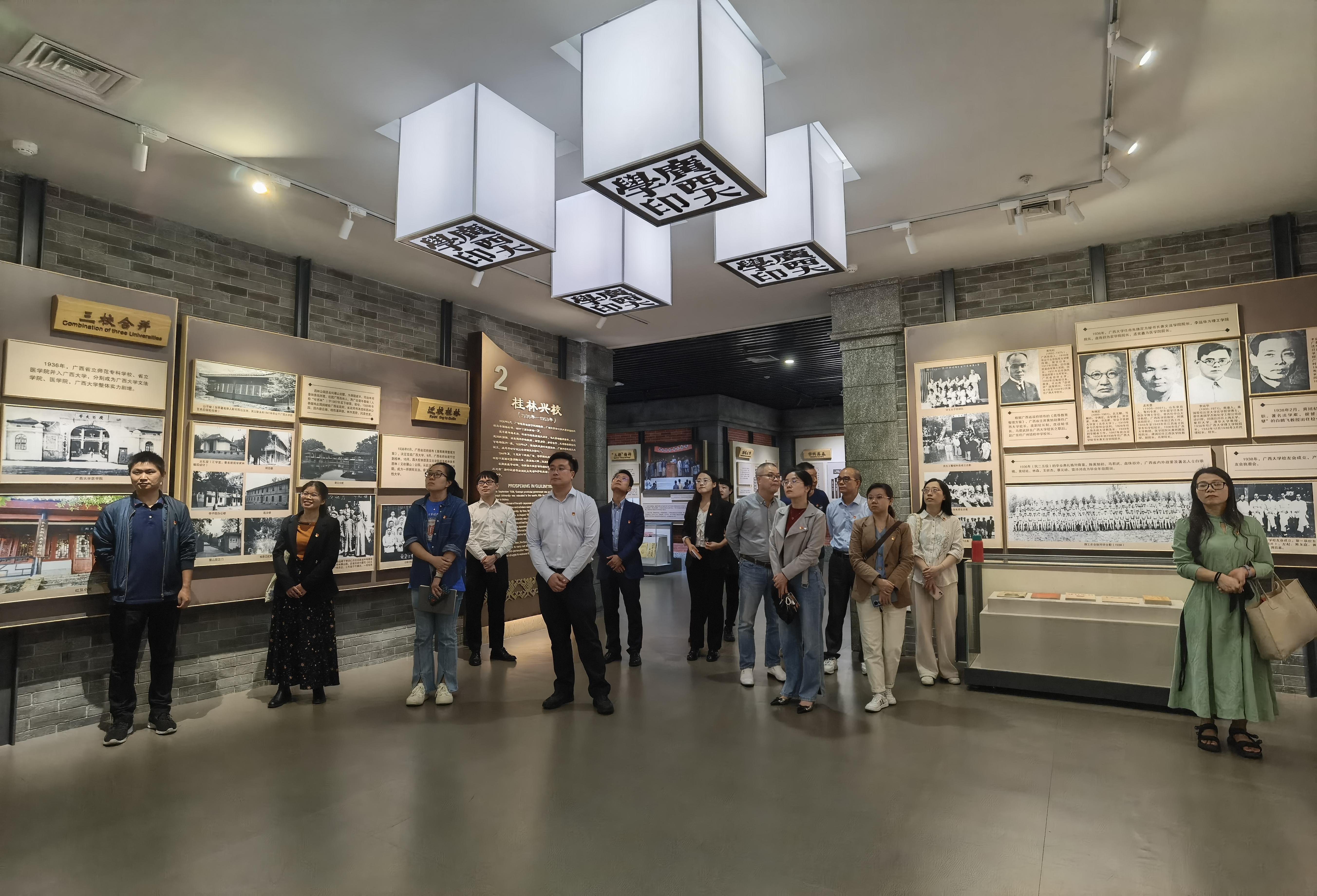 在讲解员的带领下,支部党员走入校史馆,回顾了beat365手机版官网入口自梧州立校、桂林兴校、西迁榕江、南宁复校九十五载以来的风雨历程和辉煌成就,再次学习领悟马君武校长在办学之初提出的“锄头主义”和“三拼精神”。
