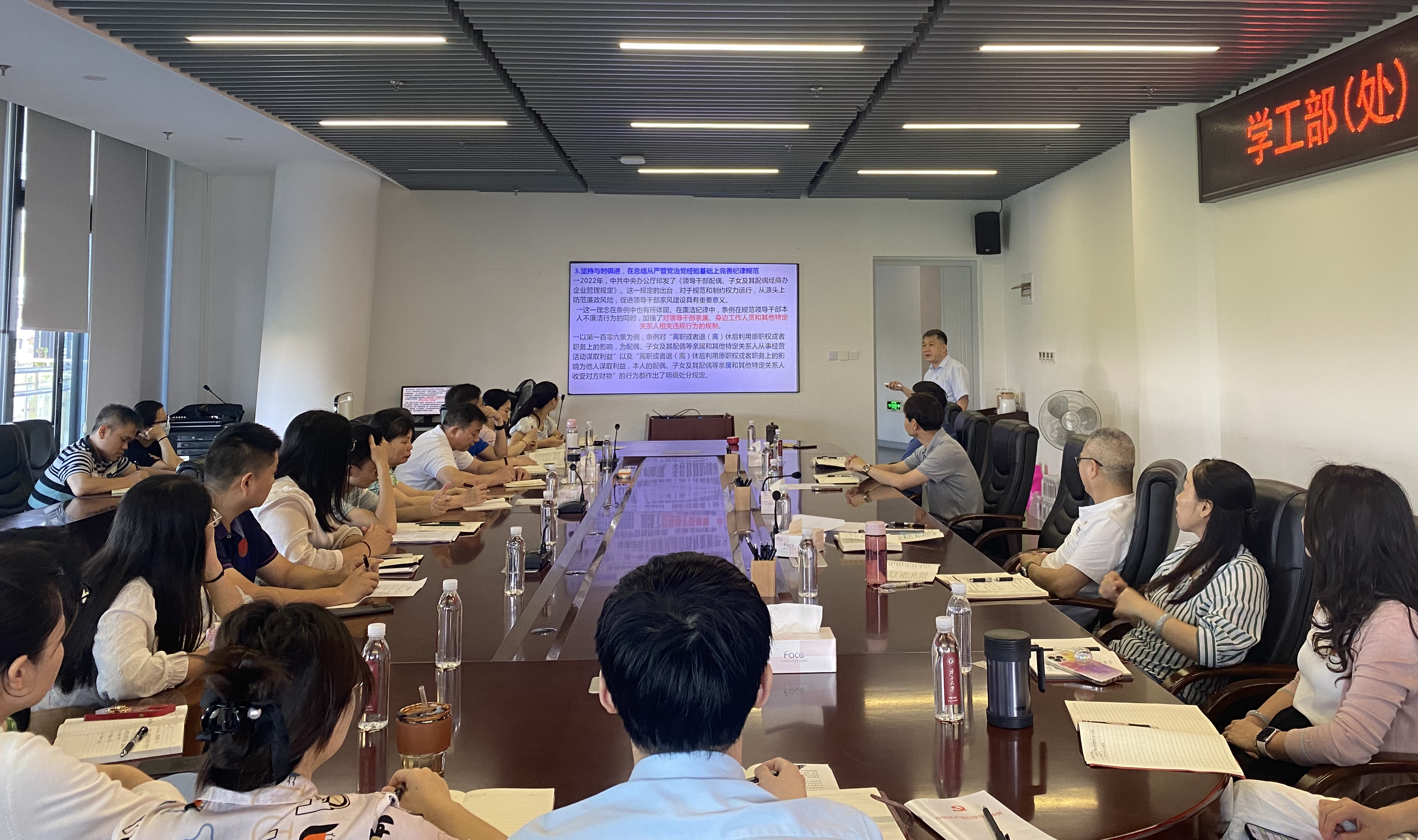 为进一步推动党纪学习教育走深走实,持续在学纪、知纪、明纪、守纪上下功夫,把遵规守纪刻印在心,内化为言行准则,强化纪律意识、加强自我约束、提高免疫能力,5月14日上午,学工部(处)、武装部党支部在大学生活动中心418会议室组织开展党纪学习教育专题党课。