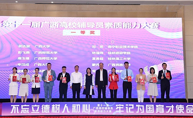 5月12至14日,由自治区教育厅主办,教育部高校思想政治工作队伍培训研修中心(广西师范大学)承办的第十一届广西高校辅导员素质能力大赛在桂林举办,共有来自全区各高校的84名专职辅导员参赛。经过三天激烈角逐,我校资源环境与材料学院辅导员吴达慧以总分第一名、工商管理学院辅导员岑汉成以总分第四名,双双获大赛一等奖,并分别获“最佳表现奖”。